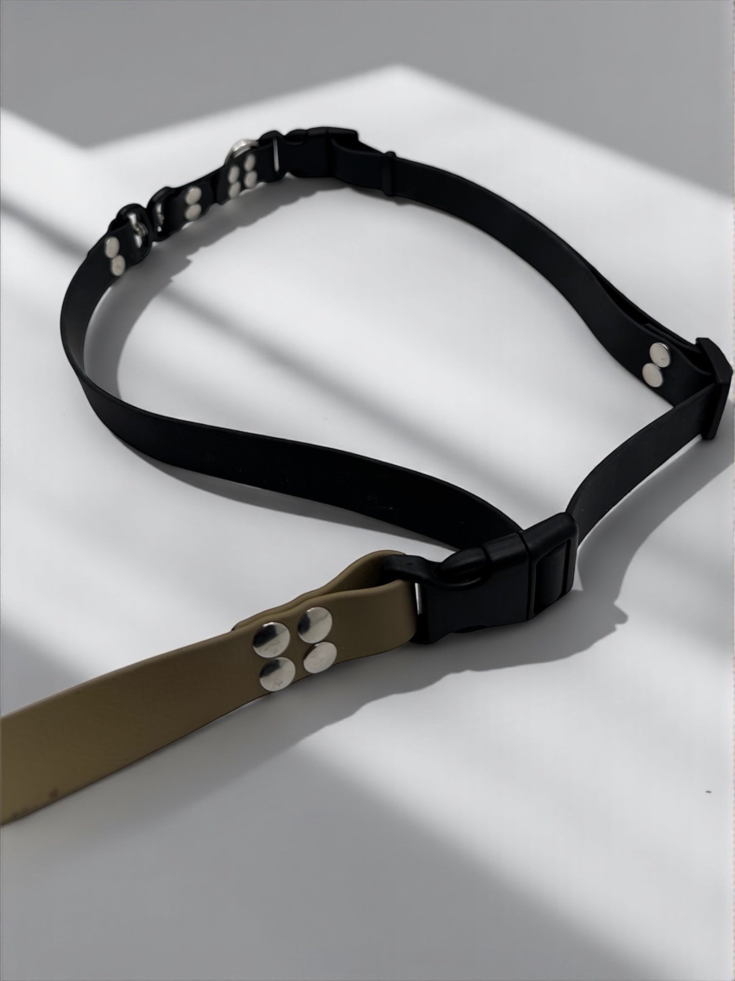 La laisse se transforme en ceinture réglable portée à la taille, conçue pour vous libérer les mains au quotidien.